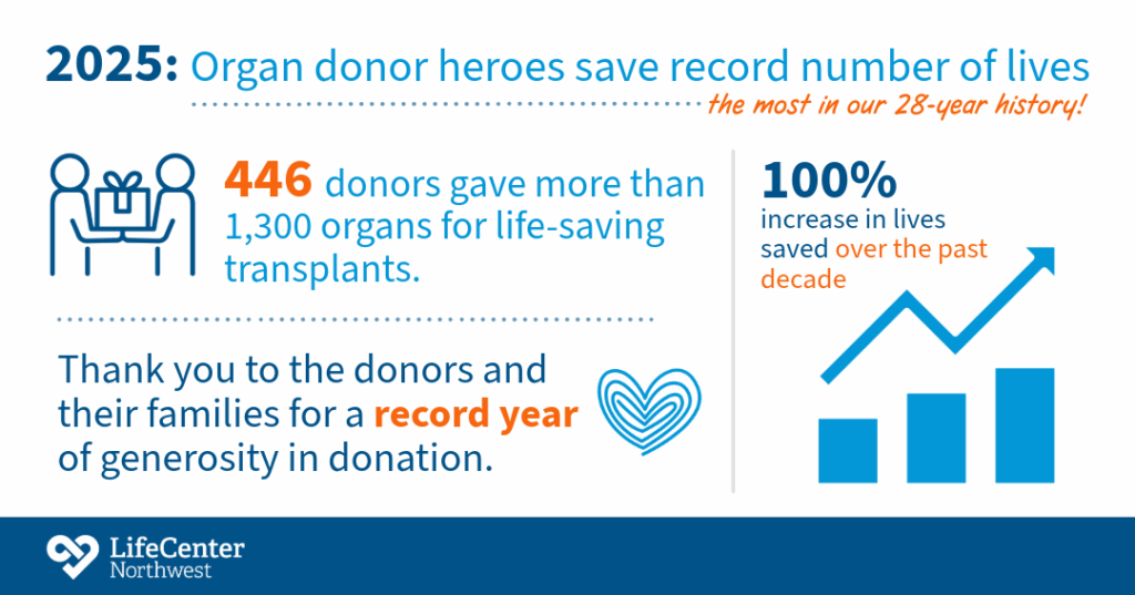 In collaboration with donor families and hospital partners across the region, LifeCenter Northwest achieved a record number of lives saved through organ donation in 2025, the most in the nonprofit’s 28 years of service.